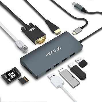 Amazon Com Kereje Usb 3 1 Type C Hub 10 In 1 Adapter Usb C 4k Hdmi 1080p Vga Converter 1gbps Ethernet Port Connector 4 Usb3 0 Ports Sd Tf Card Reader 60w Pd 3 0 Charger Port